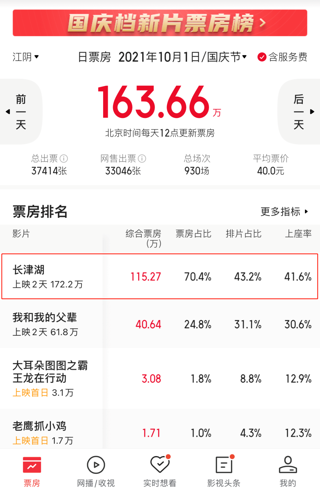 10月1日当天,江阴市民为国庆档票房贡献了163.66万元,其中七成来自《长津湖》,《我和我的父辈》紧随其后。