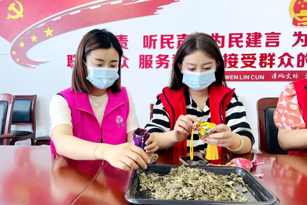 大家嘴里聊着习俗,手里做着香囊,好不热闹,不一会儿功夫,一个个精致小巧的香囊就诞生了,艾叶、丁香、白芷、川芎、藿香等中药清幽的香气弥漫开来,沁人心脾。