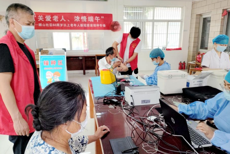 顾山社区新时代文明实践站还在居家养老服务中心开展“关爱老人 浓情端午”活动,为60周岁以上老人开设新冠疫苗接种专场。
