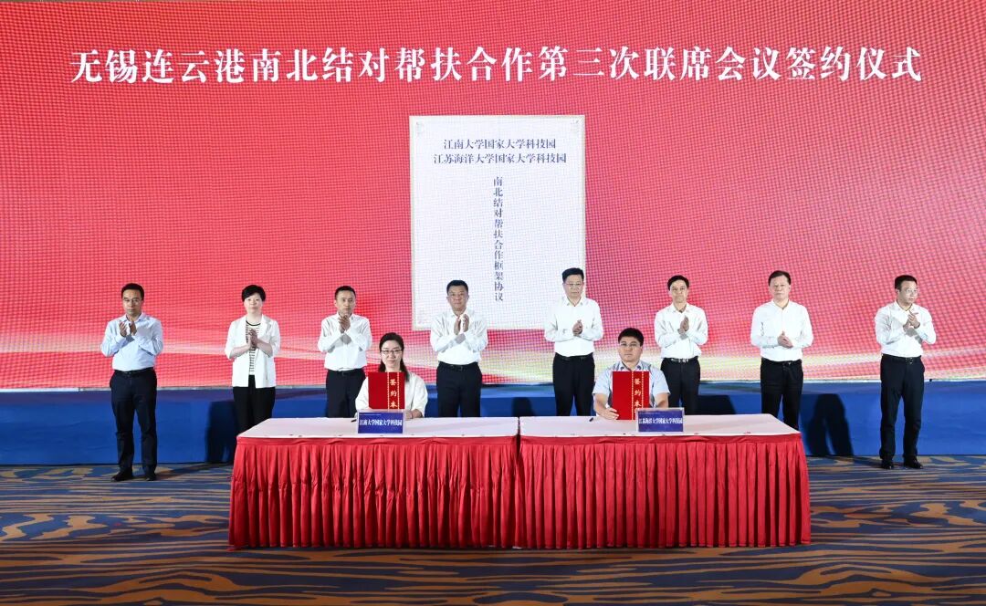 会上,无锡连云港工业园区产业发展规划发布。江南大学国家大学科技园与江苏海洋大学国家大学科技园,以及两市首批12对重点乡镇分别签订南北结对合作框架协议。