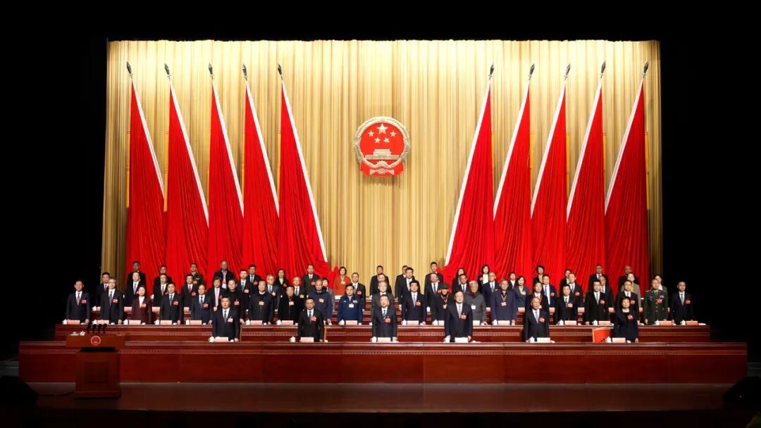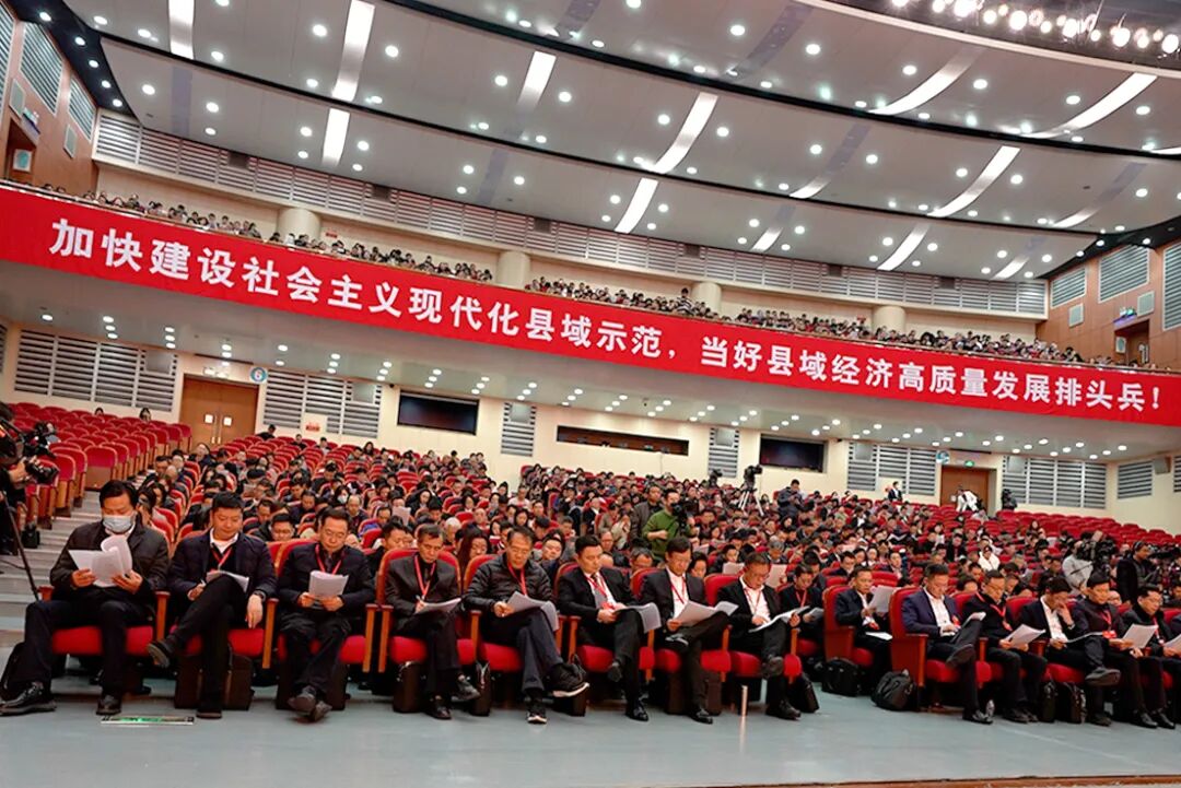 会场气氛庄重而热烈,主席台帷幕中央国徽高悬,鲜艳的红旗分列两侧。场内悬挂的“加快建设社会主义现代化县域示范,当好县域经济高质量发展的排头兵”标语,分外醒目,催人奋进。