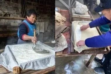 待豆花全部凝固,母亲将其舀入垫着纱布的大盆中,用纱布包好,我抱来两块木板盖上,母亲再搬来石磨压实。