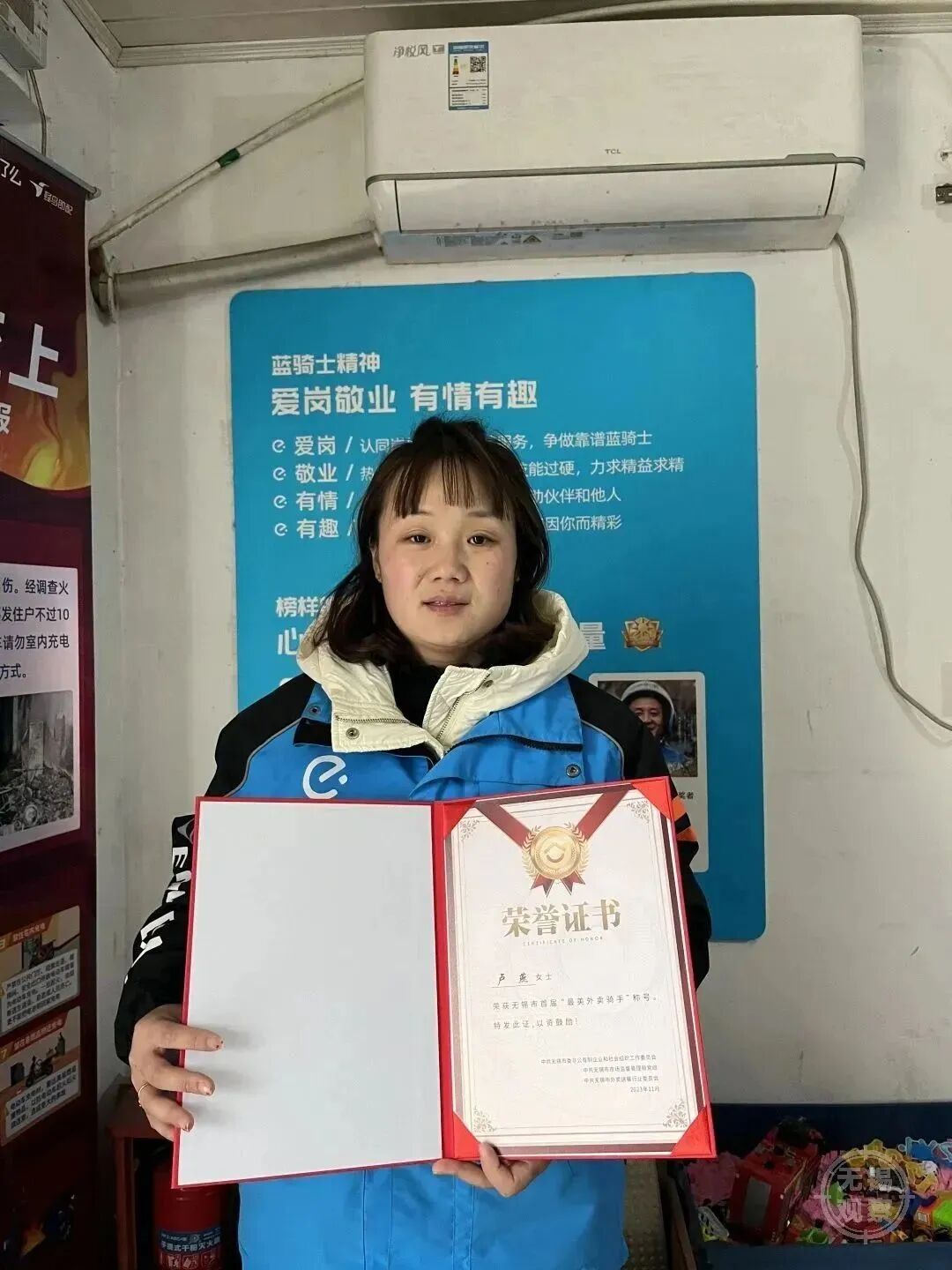 “为了让更多外地骑手能返乡,我顶他们的班送餐,要保证春节期间顾客能吃上热腾腾的饭菜。”卢燕是饿了么玉祁外卖驿站的站长,与丈夫留在无锡过年。2023年12月她刚获得“无锡最美外卖骑手”的荣誉,也是12名获奖者中唯一的女性。