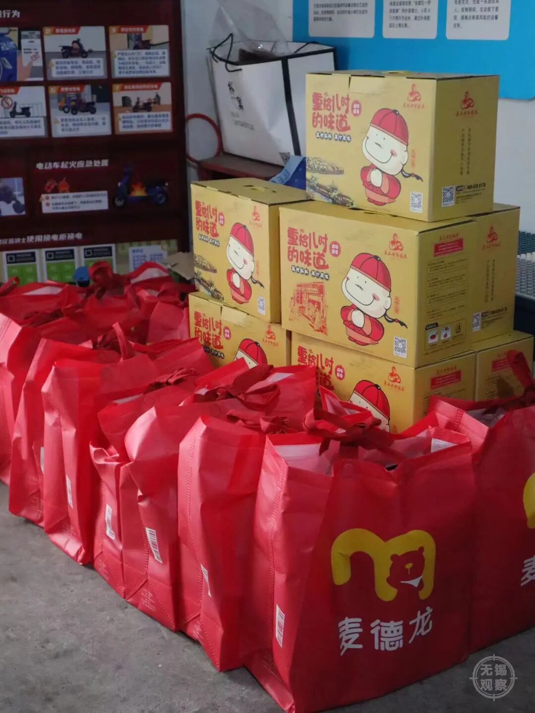自从2018年全职送外卖后,卢燕和丈夫两人每天在外奔波,今年是她和丈夫留锡过年的第五年,也是春节假期值班的第五年,除夕夜夫妻两人和站内外卖骑手在附近酒店吃了团圆饭。永安路与祁胜路交叉口往南约10米就是饿了么玉祁外卖驿站,一间小矮房里摆着两张电脑桌、一台电脑,地上整齐摆放红色袋装年货。“这是工会送给骑手的年货。”卢燕解释,因部分骑手还未领取,货物一直放在驿站内。
