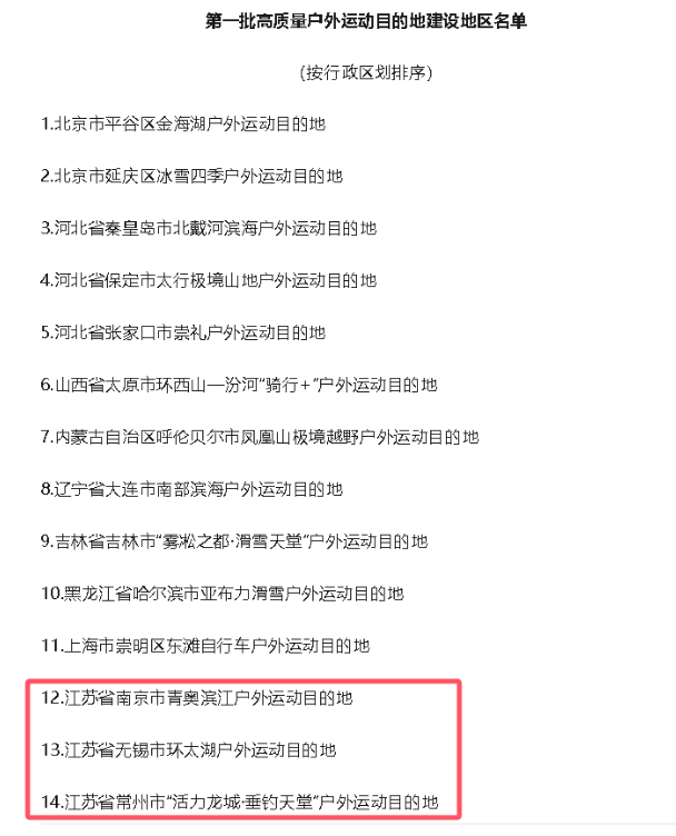 据了解,全国共有49个户外运动目的地入选,全省仅三处目的地入选,分别位于南京、无锡、常州。
