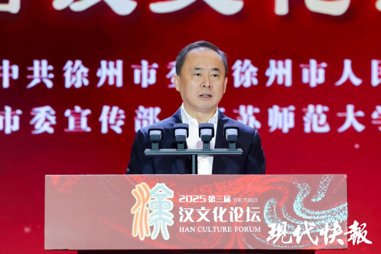 徐缨在致辞中说,本届汉文化论坛以“何以为汉·和合共生”为主题,聚焦数智传播、文明互鉴、文博考古、文脉传承等重要议题,既是深入学习贯彻党的二十届四中全会精神的具体行动,也是江苏打造习近平文化思想生动实践地的重要举措。江苏将以举办本次论坛为契机,持续深化两汉文化研究,大力推动文化传承发展,坚守根脉魂脉,推进自信自强,担当“探索新经验”的使命,让文化创新创造活力全面激发、竞相涌流。