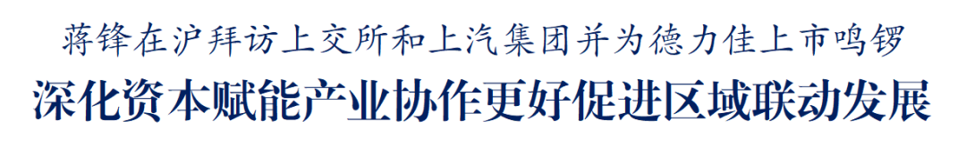 11月7日,市长蒋锋带队拜访上海证券交易所和上汽集团,并为德力佳传动科技(江苏)股份有限公司上市鸣响祥锣。他强调,要深入学习贯彻党的二十届四中全会精神,按照省委省政府部署和市委工作要求,用足用好长三角一体化发展战略机遇,高效对接上海资源,深化资本赋能和产业协作,更好促进区域联动发展。市政府秘书长陈寿彬参加活动。