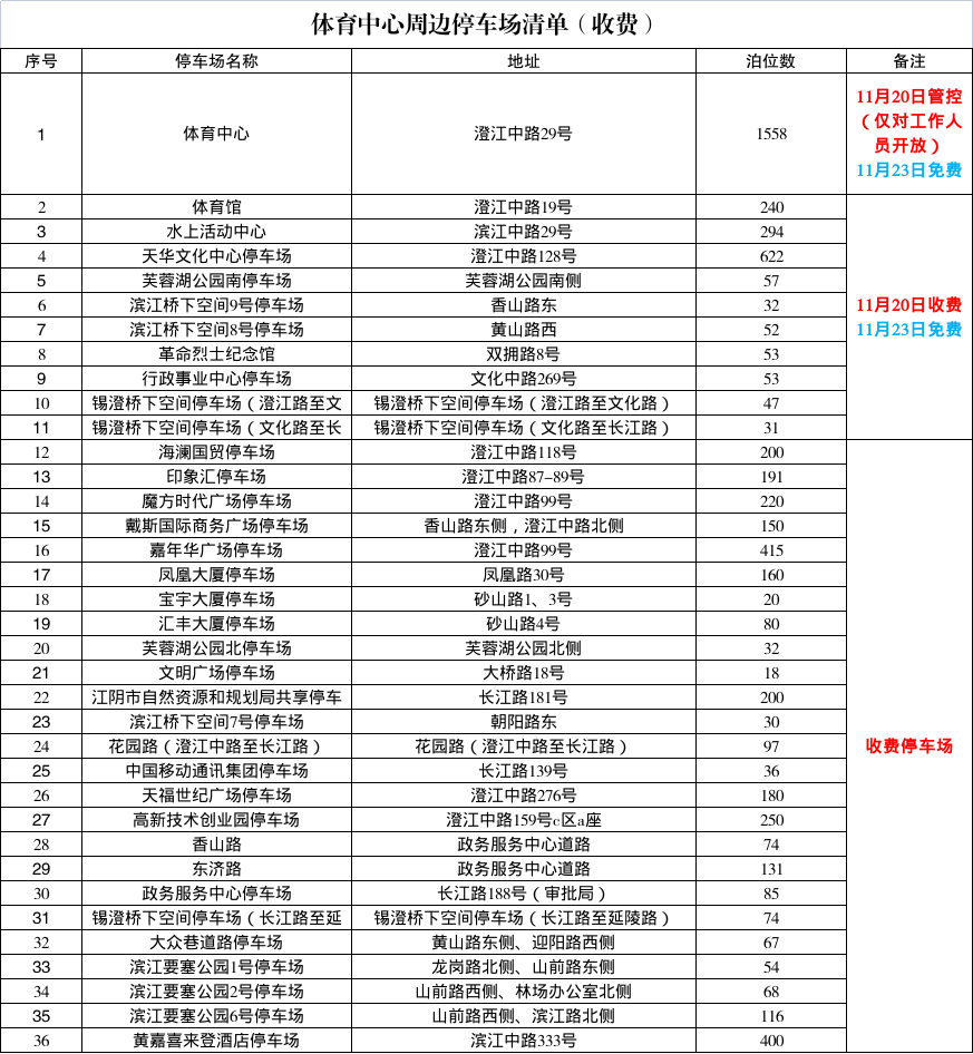 特别提醒:清单中部分政府性投资停车场11月23日(周日)足球赛当天为观众免费开放,请关注上图备注。