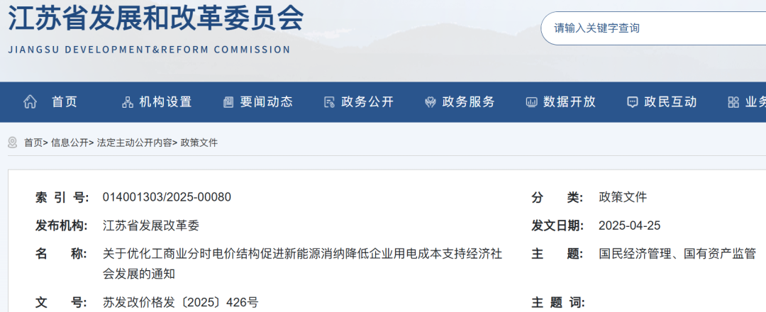 江苏省发展和改革委员会网站此前发布《关于优化工商业分时电价结构促进新能源消纳降低企业用电成本支持经济社会发展的通知》。