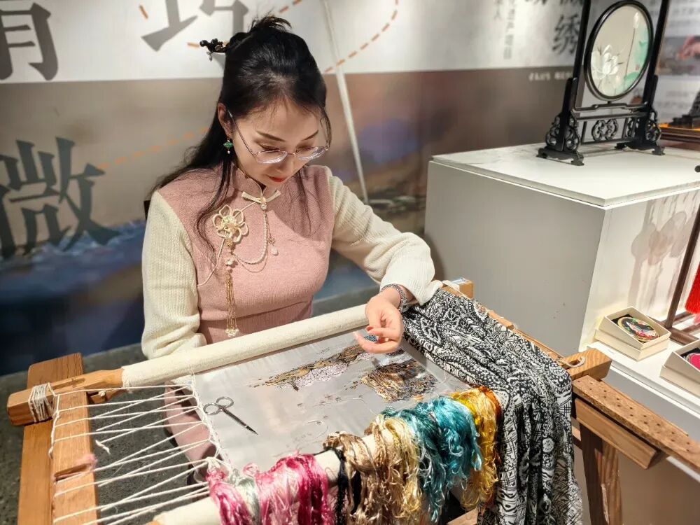 在国家级非物质文化遗产项目无锡精微绣的展台,传承人陈燕妮手指轻捻,一根蚕丝线在她手里被劈成极细的细丝。