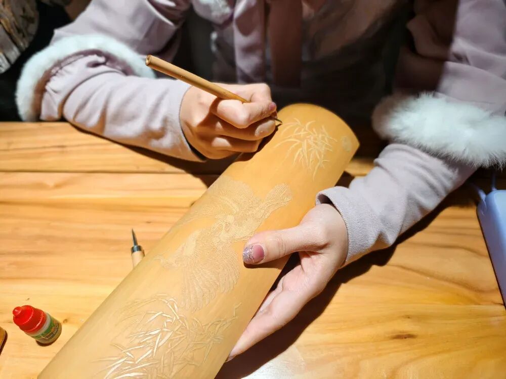 相隔不远的老宅内,竹屑轻扬。国家级非物质文化遗产项目留青竹刻展区,传承人乔瑜正运刀如飞,她在不到0.1毫米的竹青上做减法,在竹子上刻出一幅画。