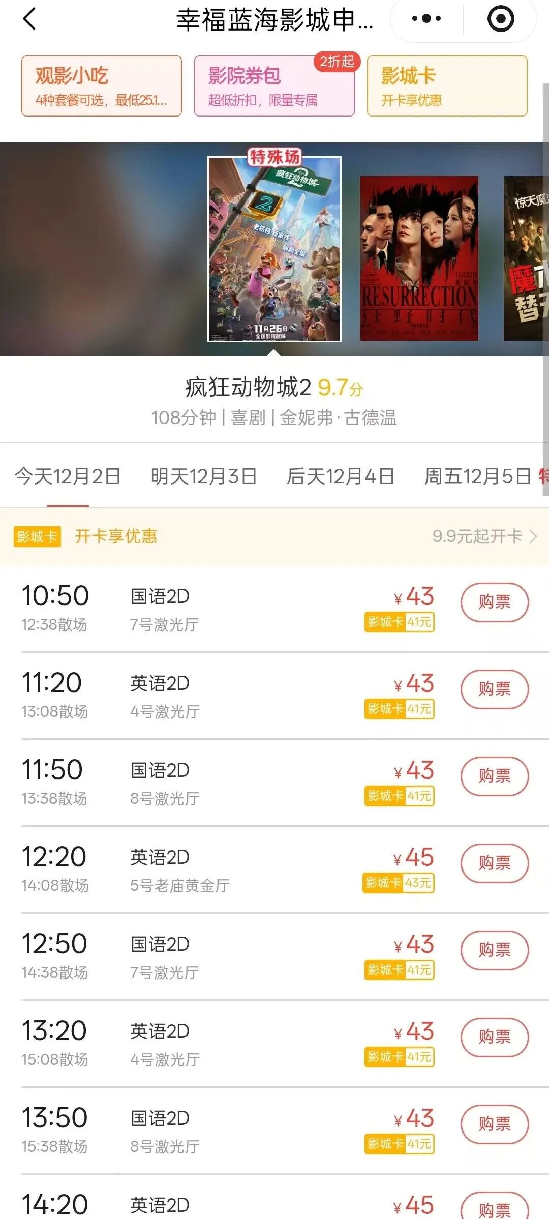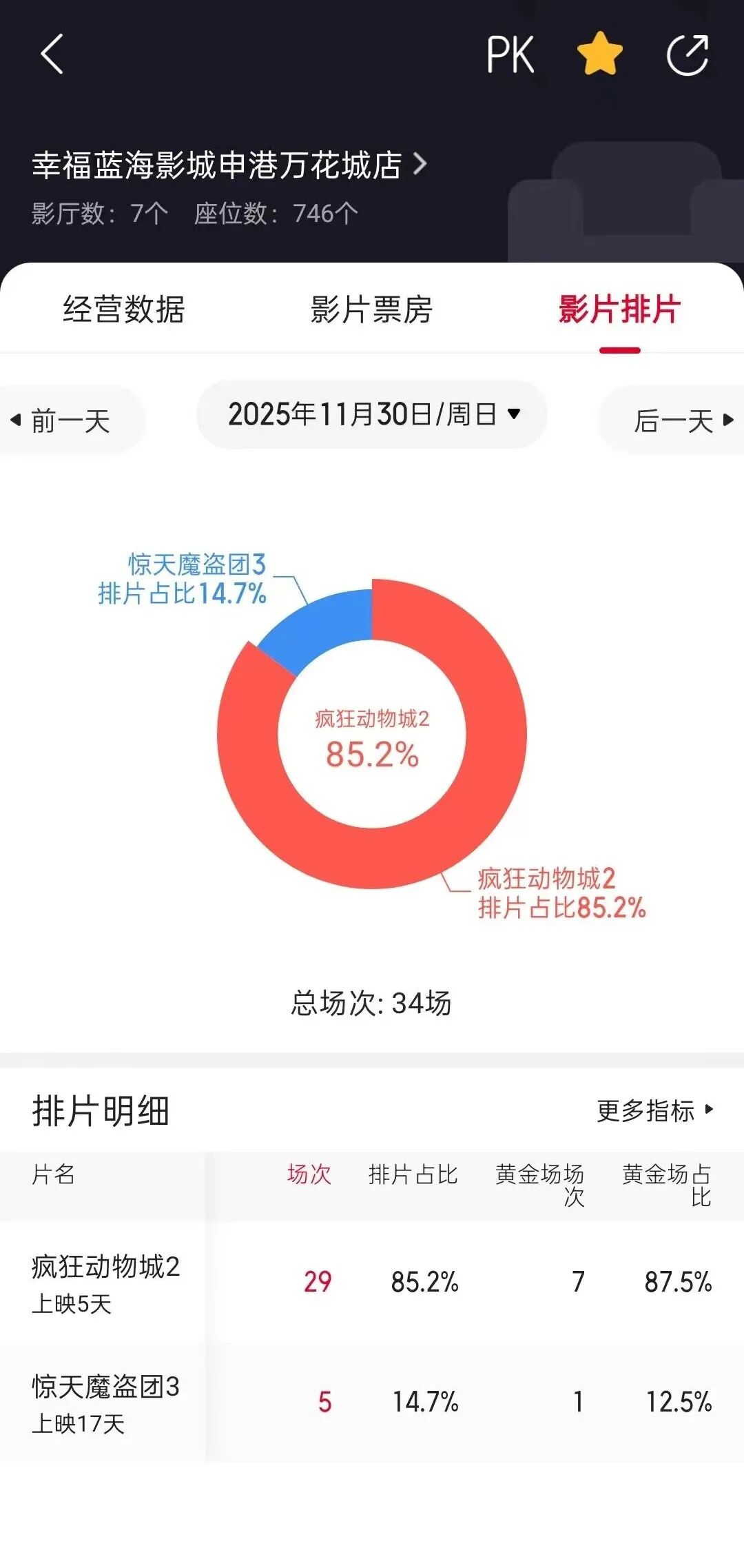 王经理还告诉小最,进影院的人流量几乎是国庆档平均观影人数的数倍,而且几乎都是冲着《疯狂动物城2》来的,“29日当天,幸福蓝海影城申港万花城店一共排了33场《疯狂动物城2》,排片占比差不多达到了八九成。”