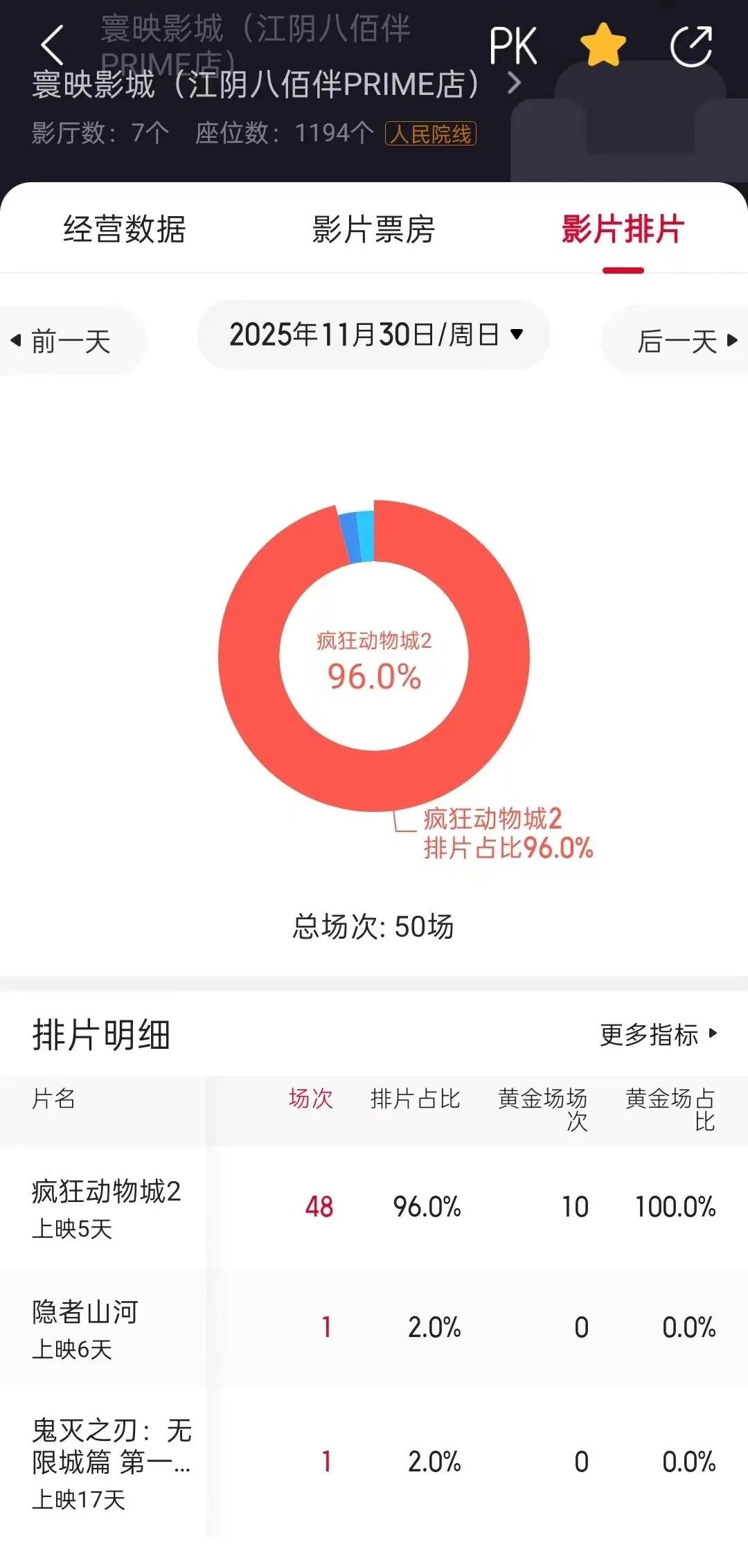 寰映影城(江阴八佰伴PRIME店)11月30日排片表显示,该影院96%的场次都在播放该电影。