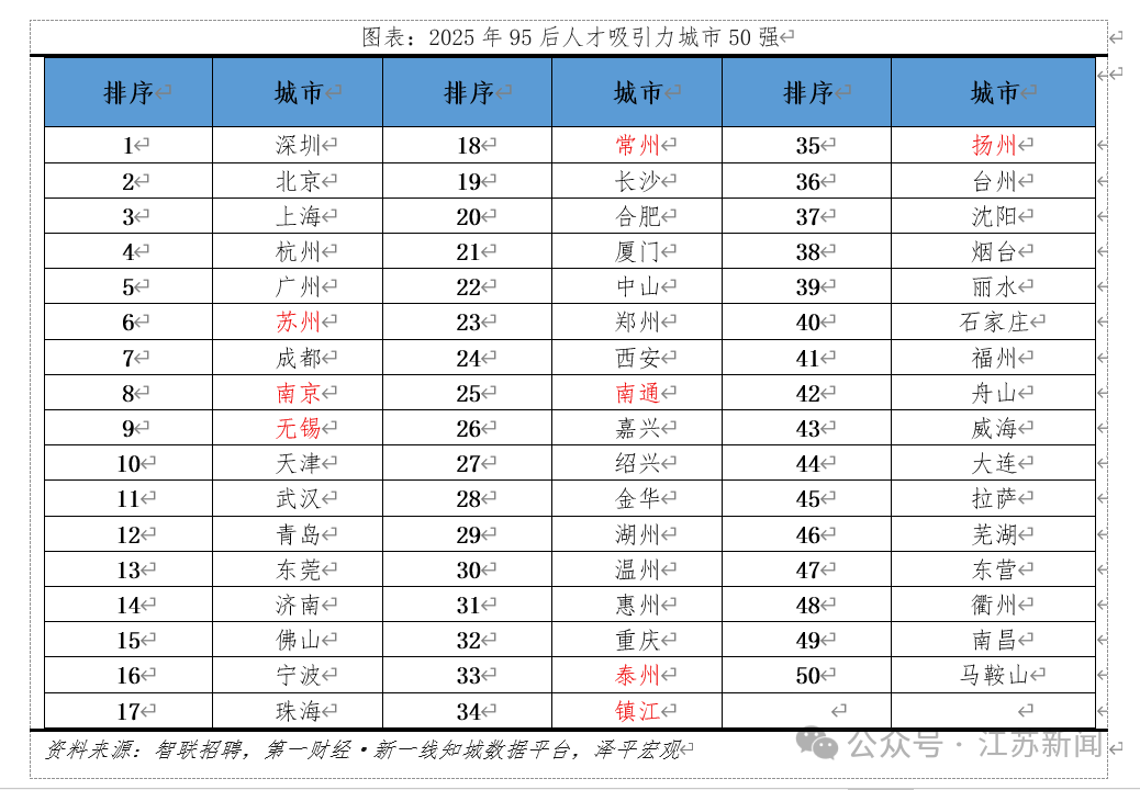 报告显示,江苏在95后人才吸引力方面表现突出,苏州、南京、无锡稳居全国前十,常州、南通、泰州、镇江、扬州也在50强之列,彰显了江苏城市在人才竞争中的强劲实力,更反映了95后群体对这些城市的青睐。