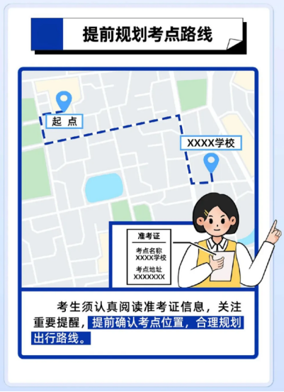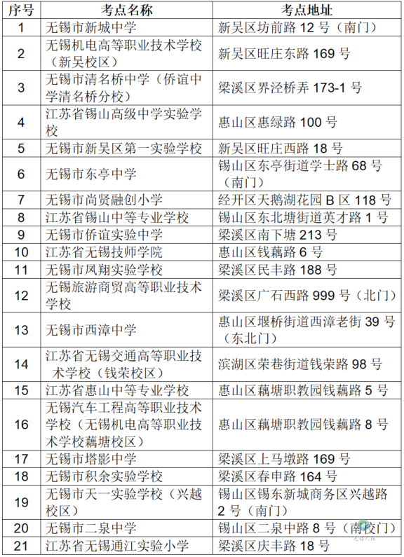 无论无锡本地考生还是外地考生均应在考试前熟悉考点地址和交通路线,提早出门,预留足够时间,避免耽误考试(迟到30分钟,禁止入场)。