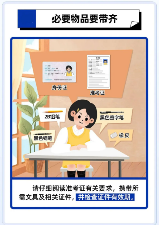 考生务必携带准考证(准考证只可携带一张进入考场)和有效期内的身份证原件,方可进入考场。