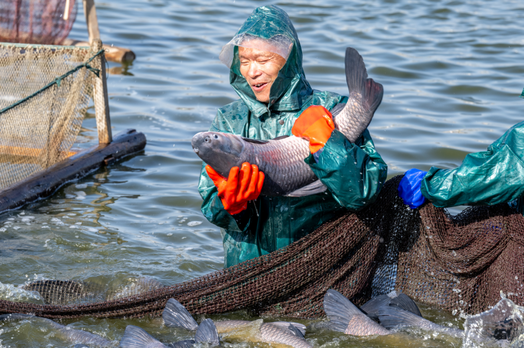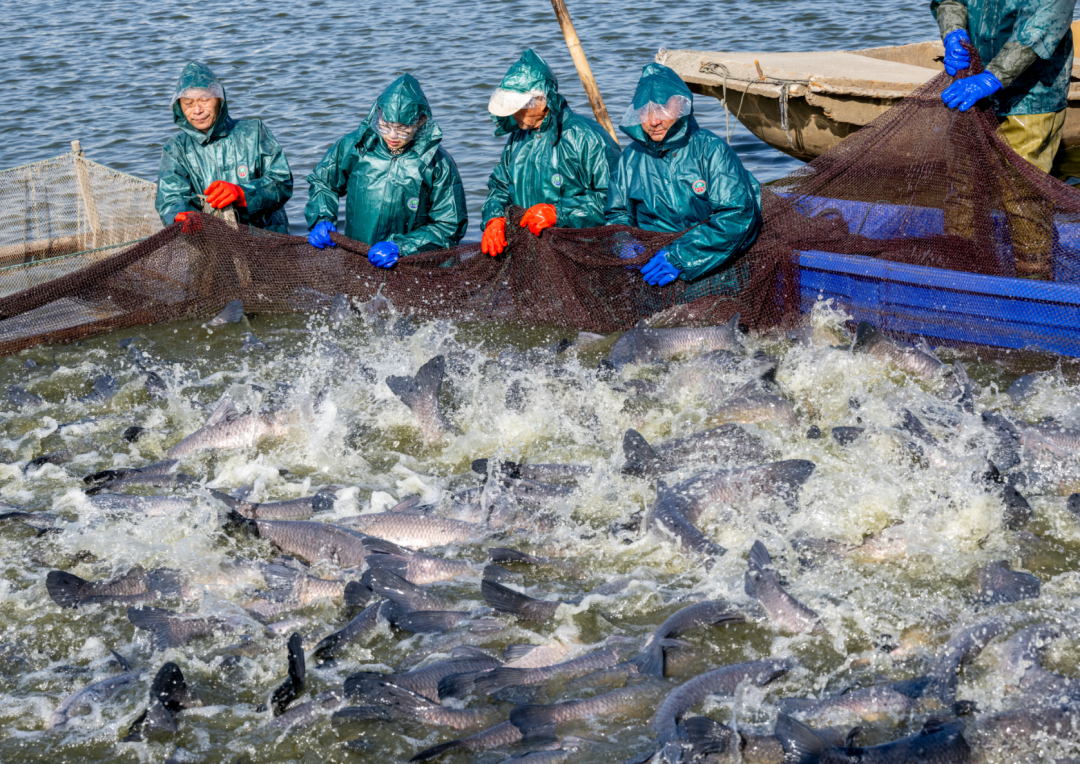 进行撒网、拉网、并塘、捞鱼、装筐……