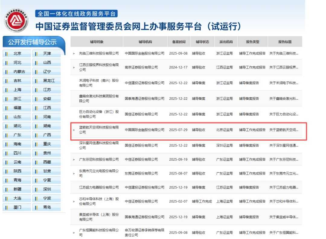 2025年12月23日,据中国证券监督管理委员会网上办事服务平台披露,蓝箭航天空间科技股份有限公司(简称“蓝箭航天”)IPO辅导工作正式完成,辅导机构为中国国际金融股份有限公司(下称中金公司)。