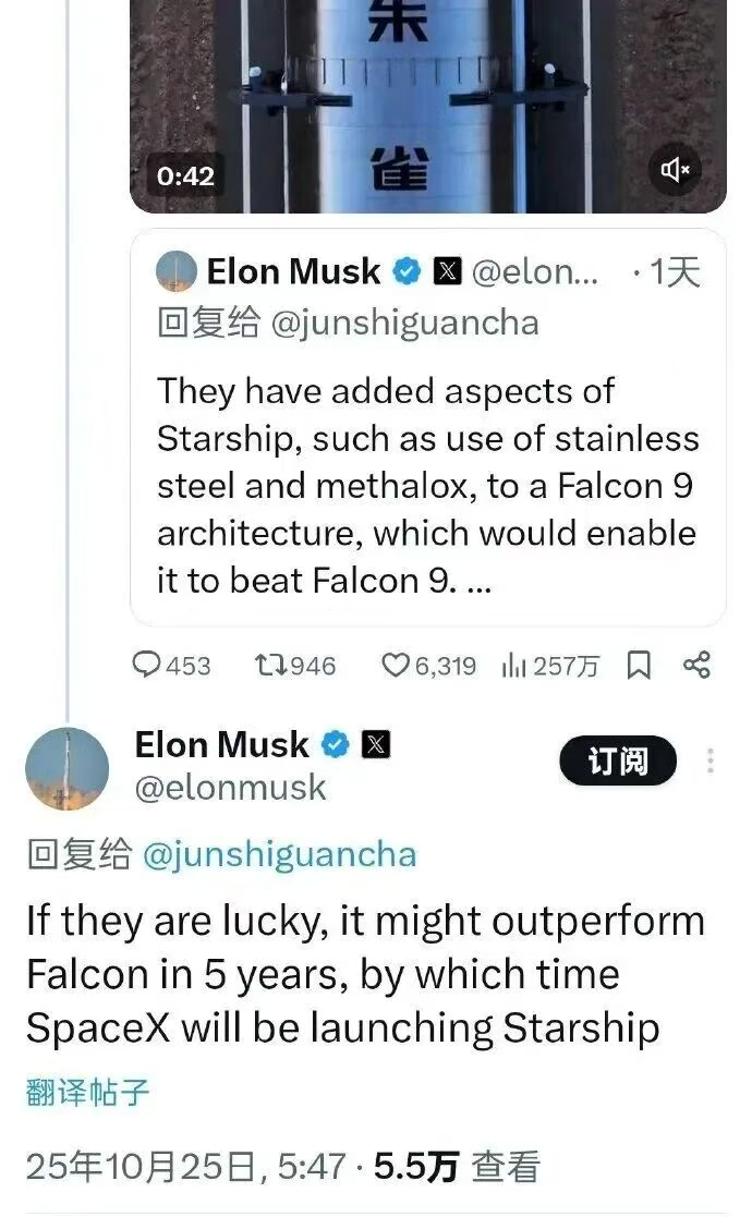 著名企业家马斯克也两度在社交媒体上提及“朱雀三号”,并表示“如果幸运,它可能会在5年后超越猎鹰号火箭”。