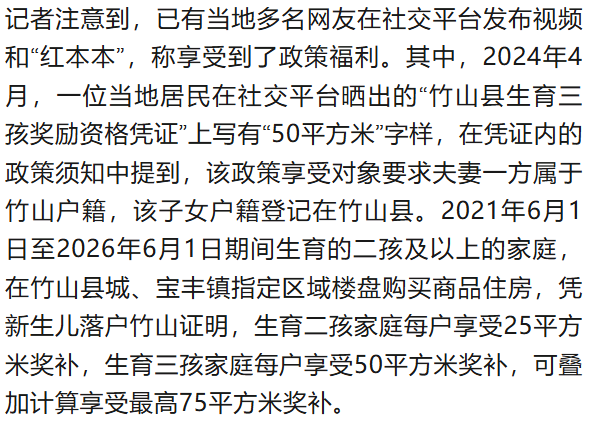 经过查询,记者看到,早在2024年,竹山县政府官网就发布了“购房补贴、生育奖补...黄金十条助力竹山城镇化发展!”的文件,其中在鼓励生育措施一项中提到,2021年6月1日至2026年6月1日期间生育的二孩、三孩家庭,从发文之日(2023年11月9日)起至2024年12月31日期间,在竹山县城区指定楼盘购买新建商品住房的,生育二孩购房奖补25平方米,生育三孩购房奖补50平方米,可叠加计算。今年3月,竹山县政府官网又发布一则关于印发《竹山县以县城为重要载体就地城镇化2025年政策措施》的通知。其中生育二孩、三孩家庭奖补措施一项指出,自2021年6月1日起至2025年12月31日,夫妻一方属竹山户籍且生育二孩、三孩家庭,在竹山县城区指定楼盘购买新建商品住房的,生育二孩购房奖补25平方米,生育三孩购房奖补50平方米,可叠加计算。