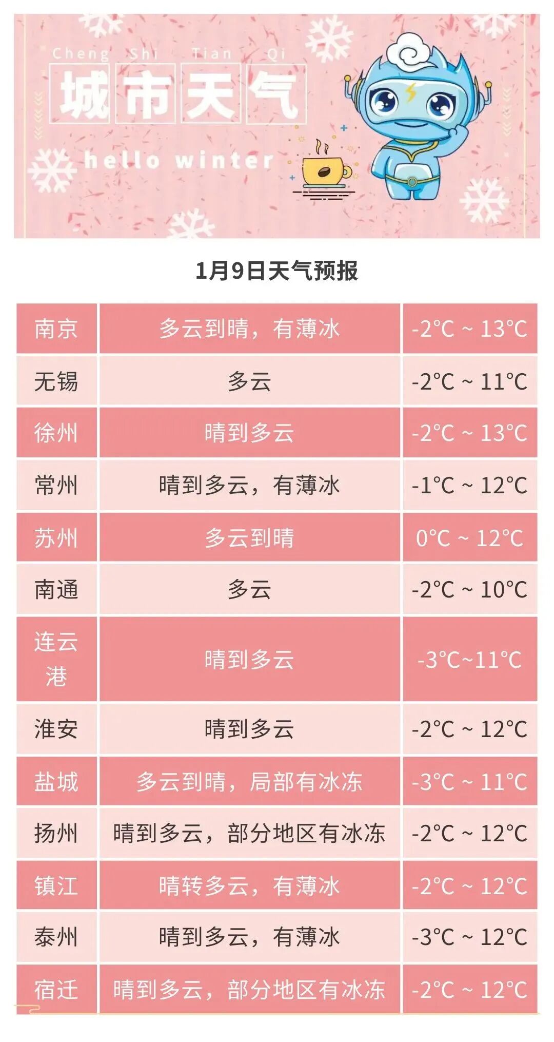 今天清晨,全省气温仍低于冰点到了白天,气温会快速回升至10℃以上预计明天早晨,全省大部分地区最低气温都会高于0℃不过,今天这波回温持续时间很短明天开始,冷空气影响江苏全省48小时最低气温降幅4—6℃12日白天开始全省气温又将明显回升