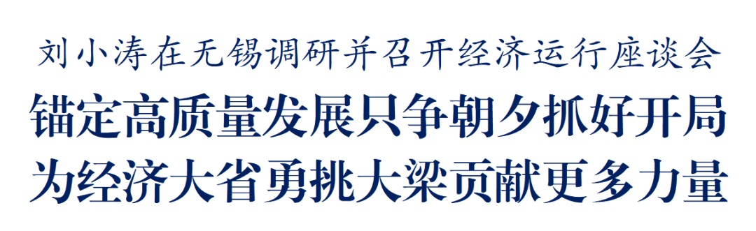 在无锡江阴,刘小涛主持召开经济运行座谈会,听取对当前经济形势和下一步经济工作的意见建议。他强调,今年是“十五五”开局之年,奋力实现良好开局至关重要。要加快推动科技创新和产业创新深度融合,营造一流创新创业生态,将投资于物和投资于人紧密结合,让人才引得进、留得住、用得好。把人工智能发展摆在更加突出位置,深化“人工智能+”行动,让人工智能更好赋能千行百业。推动服务业发展提质增效,强化生产性服务业支撑,促进生活性服务业向高品质、多样化、便利化提档升级。着力深化改革扩大开放,强化土地、金融、人才、数据、技术、物流等要素支撑,进一步提升城市开放格局和发展能级。抓好岁末年初各项工作,深入整治欠账欠薪,关心关注群众生活,有效防范化解各类风险隐患,确保社会大局和谐稳定。