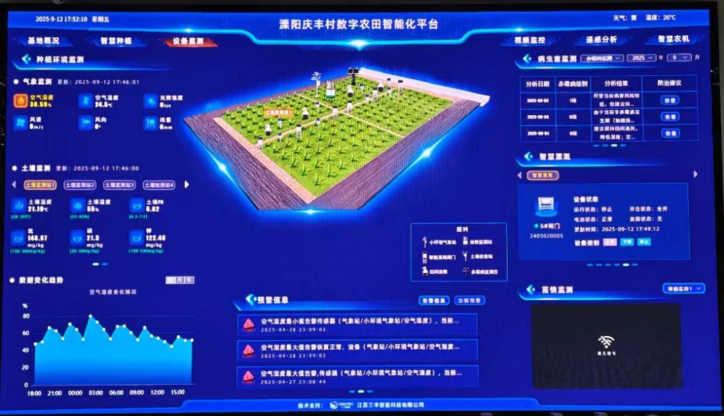 “点击手机屏幕,千亩稻田的灌溉阀门自动开启;盯着中控大屏,土壤墒情、虫情数据实时更新。”在常州溧阳市南渡镇庆丰村“江苏第一方”数字农田指挥中心,管理员任高磊的操作演示,勾勒出常州农业“科技种田”的鲜活图景。