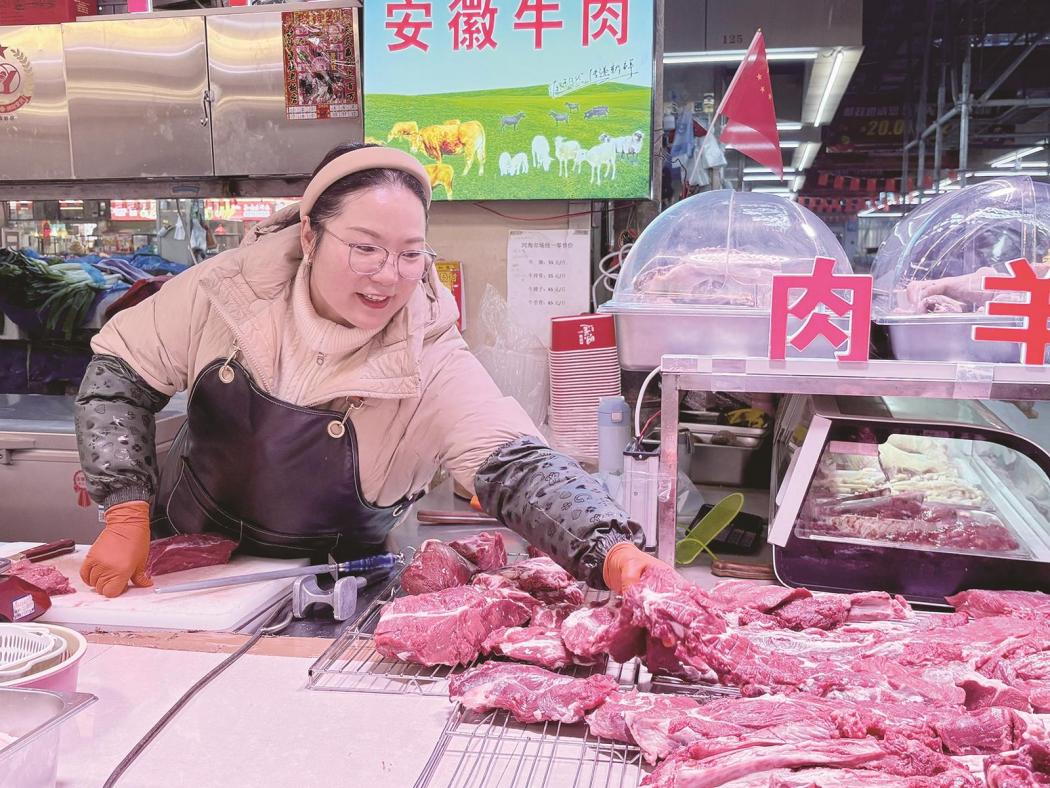 “老板,来一斤羊肉。”“好嘞,您看这块行吗?”早7时,河海菜市场已在一片灯火与人潮涌动中苏醒。蒙城黄牛肉的摊主苏琴系着围裙,手里的刀在磨刀棒上利落地刮蹭几下,开始了新的一天。