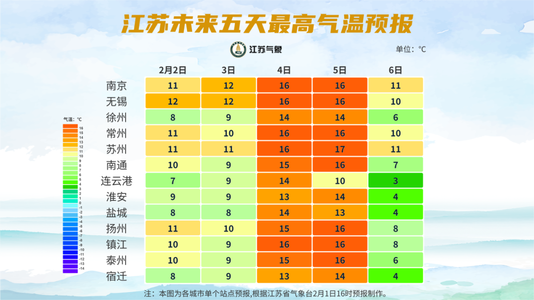 全省多云到晴。最高温度:沿江和苏南地区16~17℃,其他地区14~15℃;最低温度:苏南南部地区2℃左右,其他地区0℃左右。全省东南风转偏西风,风力都是3-4级。