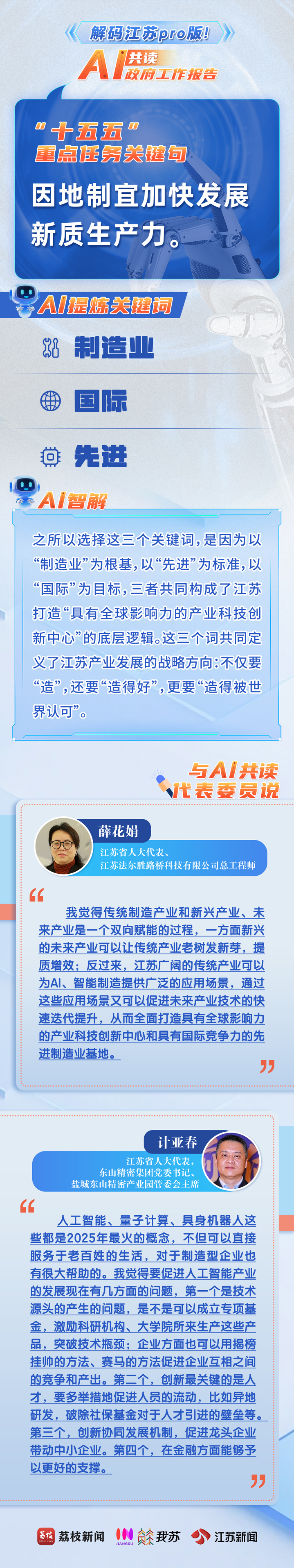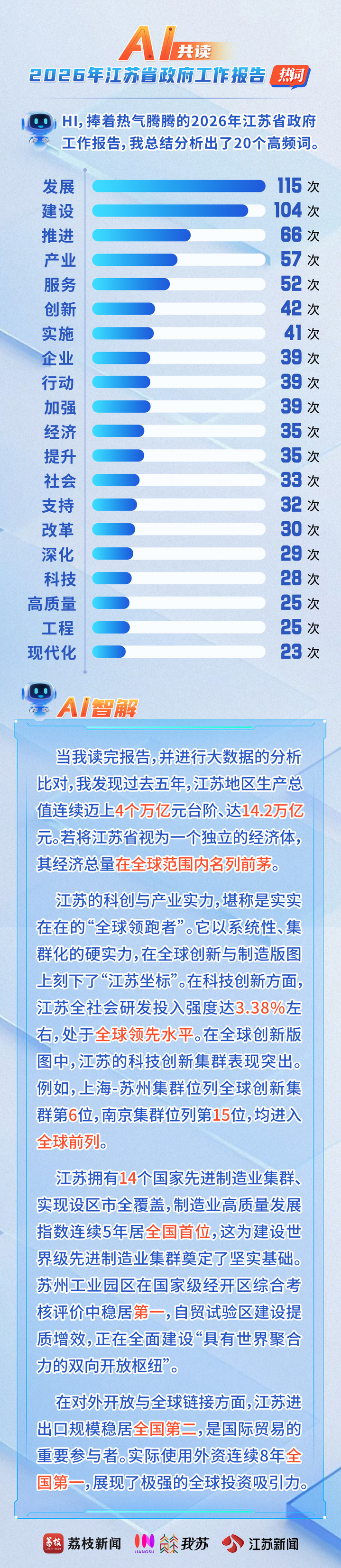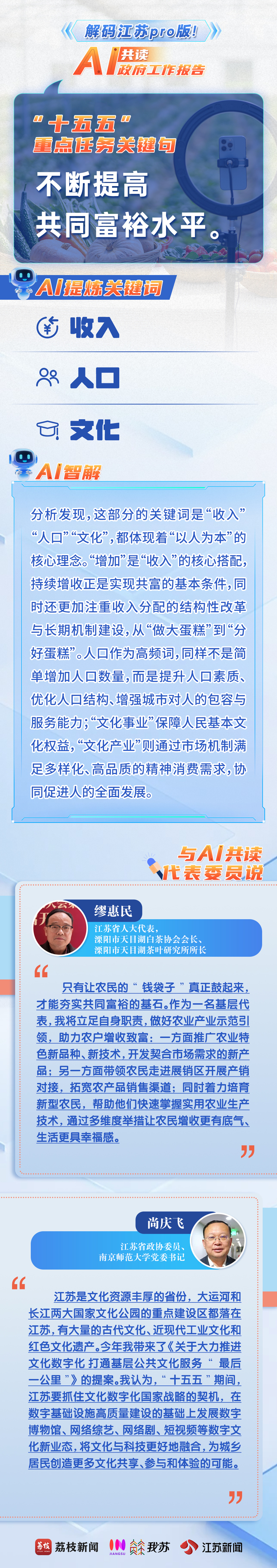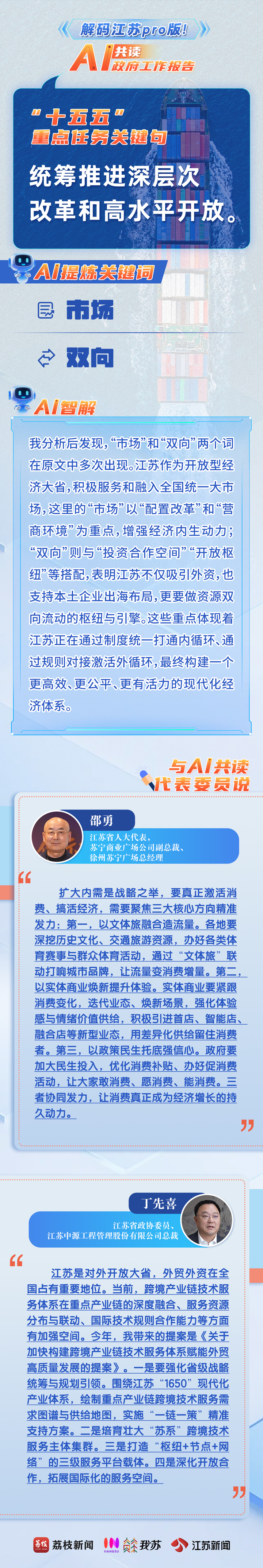 2月3日,2026年江苏省政府工作报告新鲜出炉,为奋力推进中国式现代化江苏新实践提供了行动指南。当我们把这份“沉甸甸”的报告交给AI,并请TA在全网海量数据中进行比对,AI会如何解读这份“成绩单”?与此同时,我们邀请了代表委员与AI共读报告,共话发展。他们会碰撞出怎样的思想火花?一起解码江苏PRO版!
