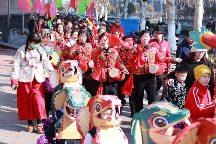 傍晚,社区广场灯光渐亮,走过小区步道时,碰见居民带着孩子拎来了一筐橘子,徐月红对记者说:“群众认你,比什么荣誉都重要。”此刻,社区的工作人员正为大年初一民俗巡游做准备。按照惯例,徐月红会带着孩子们在小区里开展民俗巡演,居民也会参与其中。