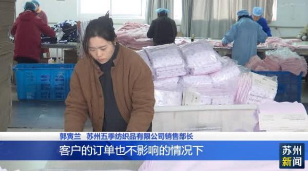 苏州五季纺织品有限公司销售部长郭寅兰说,从过了腊月十五之后,因为很多订单都要赶在年前出货,所以为了保证员工也能按时放假,客户的订单也不影响的情况下,办公室的所有工作人员就开始半天正常完成自己的工作,剩下的时间就会到车间来帮忙。(来源:苏州新闻)