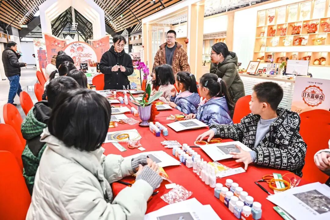 刷墨、覆纸、刷印,大小观众在工作人员的指导下,动作一气呵成,一匹匹骏马跃然纸上。春节期间,无锡博物院里,雕版印刷体验、年宵花制作、民间工艺大师展演、醒狮帽手作体验、百福图制作活动、新春专场演出轮番登场,还有“文心手造铺”吸引着众人来赶非遗大集。