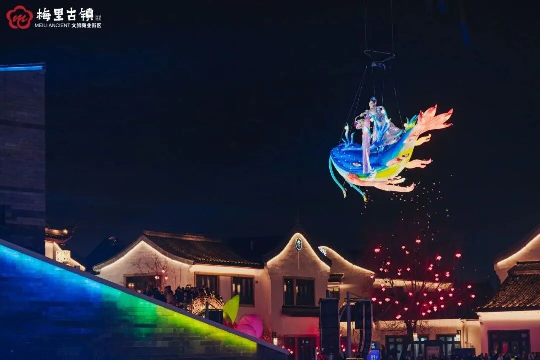 作为今年春节假期梅里古镇的一大亮点,“鲲鹏遨游 天女散花”实景演出于每日准时上演两场。画舫行歌于碧波之上,鲲鹏造型的光影装置熠熠生辉;舞者沿索道凌空翩跹,衣袂飘飘,演绎“天女散花”的唯美意境。光与影在千年水道上交织碰撞,现场观众不时发出阵阵惊叹,纷纷举起手机定格精彩瞬间。