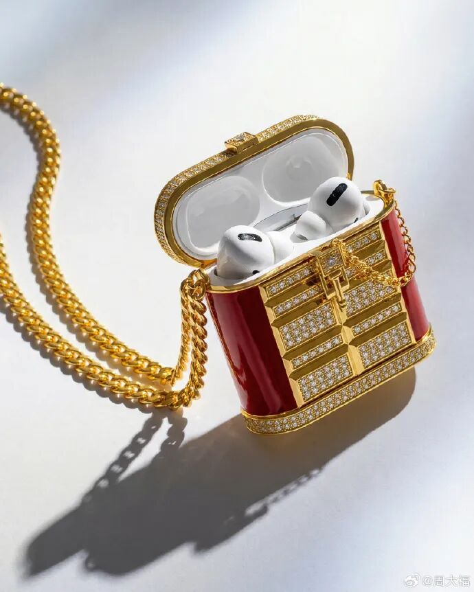 实际上早在1月8日,这款耳机盒就出现在上海港汇恒隆周大福Luxury店的展柜里,显示“独家发售”。当时柜台工作人员晒出了耳机盒的实拍图,这是一个锁包形状的耳机盒,像传喜项链的一个放大版,尺寸是71mm×82mm,采用大面积镜面空窗红色鎏彩,并镶嵌了大量钻石,像一款斜挎包一样背在身上。