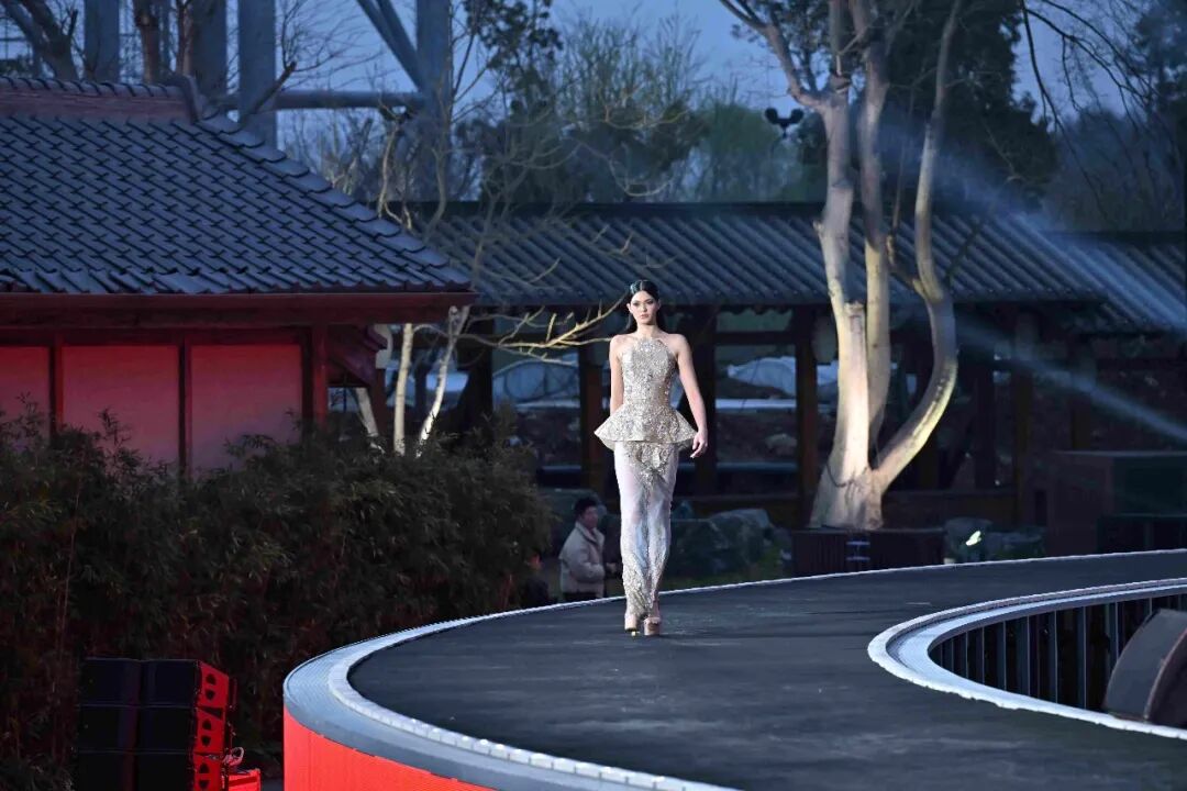 拈花湾的禅意山水之中,FENDI领衔开幕大秀,模特步履从容,将意式优雅与当代创意完美融合,利落廓形与细腻手工在光影中流转,每一步都在书写品牌独有的贵气与从容,这是独属于无锡的东方高定之夜。