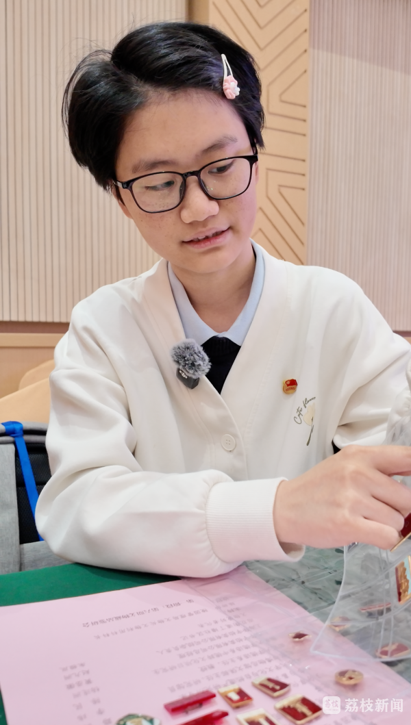 活动现场,另一张青涩的脸庞安静地坐在角落,面前整整齐齐摆放着一排红彤彤的纪念章。她是南京特殊教育学院大二学生裴倍,一个与同龄人有着不同“追星”方式的“05后”:“我比较喜欢收集圣地章,又因为我是南京人,对雨花台比较感兴趣,所以我就比较喜欢收集雨花台的圣地章。基本上我能找到的我都收集到了。”