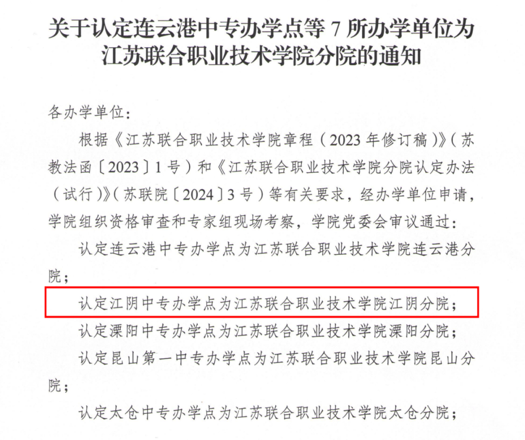 2024年3月,江阴中专高分通过五年制高职办学单位人才培养工作水平评估。2024年10月,在江阴市委市政府、江阴市教育局的全力支持下,江阴中专正式向联院提出分院认定申请。2024年12月,学校顺利通过了江苏联合职业技术学院江阴分院认定的现场评估。2025年1月,江苏联合职业技术学院下发了《关于认定连云港中专办学点等7所办学单位为江苏联合职业技术学院分院的通知》,江阴中专在本轮认定的7所分院中位列第二。