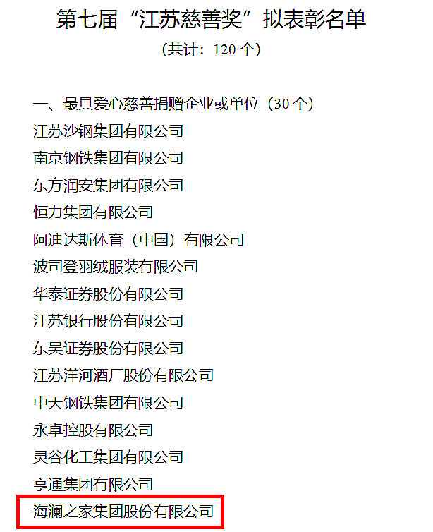 据了解,根据第七届“江苏慈善奖”评选表彰有关要求,经各地或有关部门推荐、专家评审、征求意见、考察等程序,已确定120个单位、个人和慈善项目为第七届“江苏慈善奖”拟表彰对象。此次入选的海澜之家,多年来累计捐款9985万余元。企业于2014年发起“多一克温暖”公益行动,旨在将分散而有限的社会公益力量整合起来,捐赠定制羽绒服帮助中西部山区师生温暖过冬。10多年来,海澜之家“多一克温暖”公益行动,目前已扩展到新疆、西藏、内蒙古、青海等24个省(自治区、直辖市)的1700所偏远学校,为偏远山区师生以及灾区等共计送出30万余件冬衣与物资。此外,海澜之家还发起冬令营、引进教育资源、开展多项文化主题活动,丰富孩子们的课余生活,帮助他们探索未知的世界。