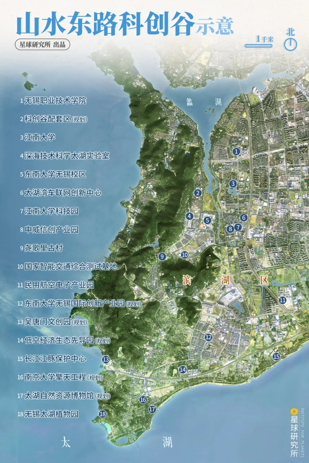 而在其中,山水东路科创谷又串联起最美湖畔的“湖岸线”和“山脊线”,集中江南大学、东南大学无锡校区、中国船舶七〇二所、江南计算技术研究所等全区80%以上的科创资源,形成“背靠湖山、面朝创新”的独特格局。
