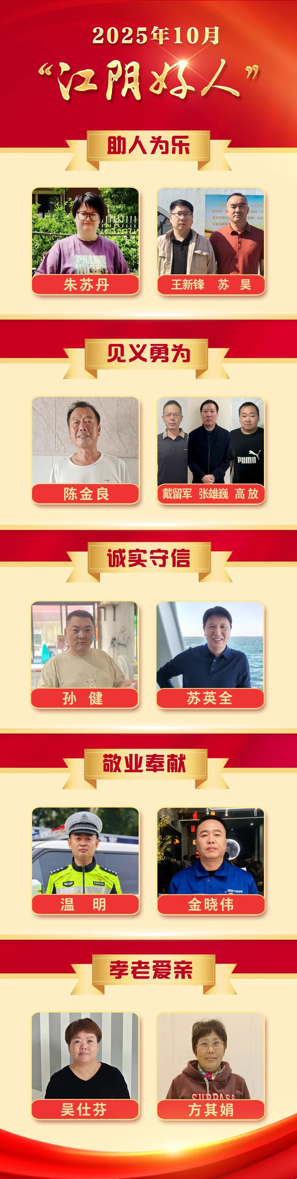近年来,我市持续开展“我推荐我评议身边好人”活动,通过发现和传播平凡生活中的善行义举,让崇德向善的社会风尚日益浓厚。在活动中,一个个温暖人心的故事被传颂,爱岗敬业的职业精神得到弘扬,孝老爱亲的家庭美德持续滋养,向上向善的个人品格不断闪光,共同汇聚成江阴这座文明城市最动人的精神底色。