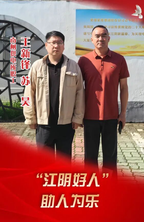 王新锋,男,1971年生,苏昊,男,1989年生。两人均为南闸供电所职工。2025年6月3日下午4时,南闸街道河西路,一位骑电动自行车的阿姨突然摔倒在地无法动弹。危急时刻,王新锋与苏昊毫不犹豫地冲上前去施救。王新锋凭借丰富的急救培训经验,半蹲着安抚伤者,仔细检查伤情;苏昊则迅速拨打120,清晰描述位置与伤者状况,并疏导围观人群、移开电动自行车,保障现场空气流通。医护人员抵达后,对二人专业的应急处理给予高度评价,称其做法“避免了并发症风险”。待伤者送医后,两人默默返回工作岗位,他们用善举传递了社会正能量。