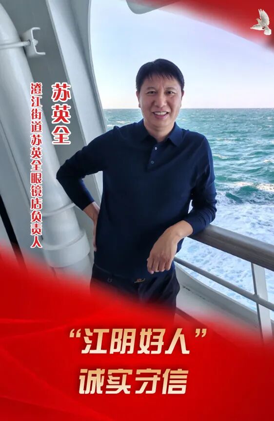 苏英全,男,1974年生,澄江街道苏英全眼镜店负责人。1995年,苏英全观察到近视人群逐渐增多,眼镜消费市场庞大,便在江阴开设了第一家眼镜店,很快吸引了大量消费者。尽管生意兴隆,他始终冷静地告诫店员:时刻牢记诚信待客,永远坚持价廉物美。苏英全不断提高产品质量和服务水平,采购进口磨边机、自动验光仪,开展系统培训,引入技术骨干,邀请眼科专家,打造实力服务团队,提供一体化验配服务,吸引顾客无数,先后开设了5家分店。苏英全眼镜店获得“首批江苏省质量达标先进单位”“江阴市消费者满意单位”“无锡市诚信计量示范店”“江阴市百佳诚信单位”等荣誉,成为群众赞誉的诚信经营榜样。