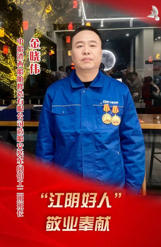 金晓伟,男,1980年生,中船澄西船舶修造有限公司造船安装车间钳工二班班长。金晓伟1999年进厂,凭借特别能吃苦、特别能钻研的敬业奉献精神,始终奋战在造船生产一线,累计参与百余艘船舶的建造任务,从一名普通的船舶钳工成长为船舶钳工特级技师、中船澄西在聘船舶轮机装配与修理领域(船舶钳工分领域)技能带头人。他主导钻研的多项新技术不仅大大缩短了修造船工期,也为公司每年节省100余万元成本,他研发的“自制手动剥皮机”“锚机轴瓦取出工具”等获得了发明专利。作为班组长的他,注重集体共同成长,紧抓班组建设,并成立了金晓伟劳模创新工作室。金晓伟先后获评无锡市劳动模范、江苏省行业工匠,享受国务院政府特殊津贴。金晓伟劳模创新工作室被无锡市总工会命名为“第六批无锡市示范性劳模创新工作室”。