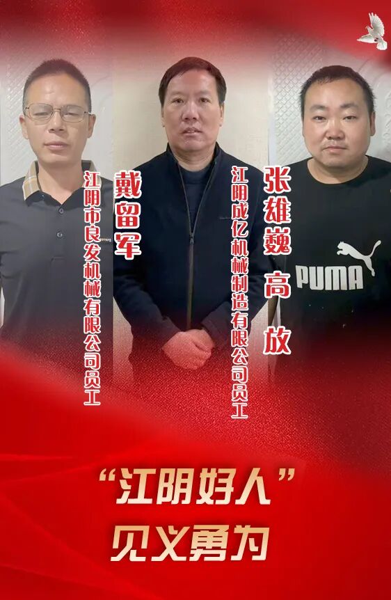 戴留军,男,1981年生,江阴市良发机械有限公司员工;张雄巍,男,1969年生,高放,男,1990年生,江阴成亿机械制造有限公司员工。2025年7月13日下午4点多,戴留军路过良发机械有限公司门口时,听见厂里的员工在招手呼救,循声望去,只见厂门口朝西处有一辆电动三轮车失控冲入河沟,车主被困车中无法脱险。由于事发河面宽阔、两侧陡坡近三米高,一个人施救非常困难,戴留军便喊来了两位工友高放与张雄巍一起下水救援。三人在水中摸索一阵后发现,电动三轮车的车头是全封闭结构,车主被困车中已逐渐失去意识。他们合力摸索,奋力打开驾驶室门将老人救出。老人被救上岸时脸色发白、嘴唇发紫,已经停止了呼吸。他们轮流给老人进行心肺复苏,经过近十分钟的抢救,老人最终脱离了生命危险。救援过程中,张雄巍价值3000多元的手机因进水损坏,但他却只字未提,而是默默地和工友一起回到了工作岗位。