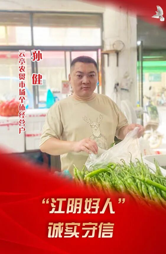 孙健,男,1990年生,云亭农贸市场个体经营户。2025年3月16日,一名顾客在孙健的摊位买菜扫码付款时,不慎将六位支付密码误输为金额,转眼间,孙健的手机就收到了一笔“巨款”。面对这笔意外之财,小孙没有丝毫犹豫,第一时间放下手中的活儿,一边向市场管理处报备,一边在顾客群里紧急寻人。通过多方查找和核对流水,他终于联系上了那位粗心的顾客。当满脸错愕的顾客匆匆赶到市场,拿到全数退还的钱款时,激动得说不出话来。小孙却只是憨厚地笑了笑,说:“这钱不是我的,我一分都不能拿,这是最基本的道理。”