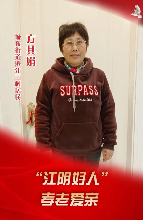 方其娟,女,1963年生,城东街道滨江二村居民。自2008年公公去世后,方其娟便主动承担起照顾年近八旬婆婆的重任,精心打理婆婆的生活起居,耐心照顾陪伴,缓解老人的孤独。2020年,婆婆不慎摔跤后瘫痪在床,方其娟肩上的担子更重了,她无微不至地擦洗、喂饭、日夜看护。十余年来,面对辛劳她始终毫无怨言。她常说:“婆婆就是亲妈,照顾她是应该的。”她的孝心邻居们都有目共睹、无不称赞。方其娟用实际行动深刻诠释了中华孝道美德,用无私付出展现了超越血缘的亲情守护,也为家人和邻里树立了榜样,无声地传递着孝老爱亲的温暖力量。