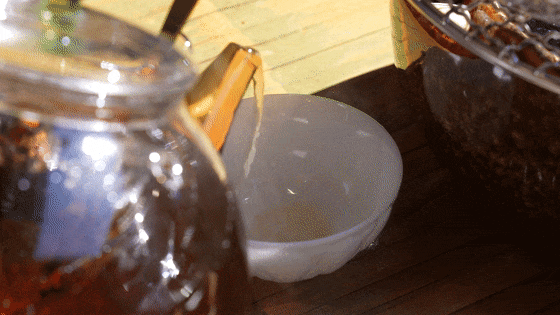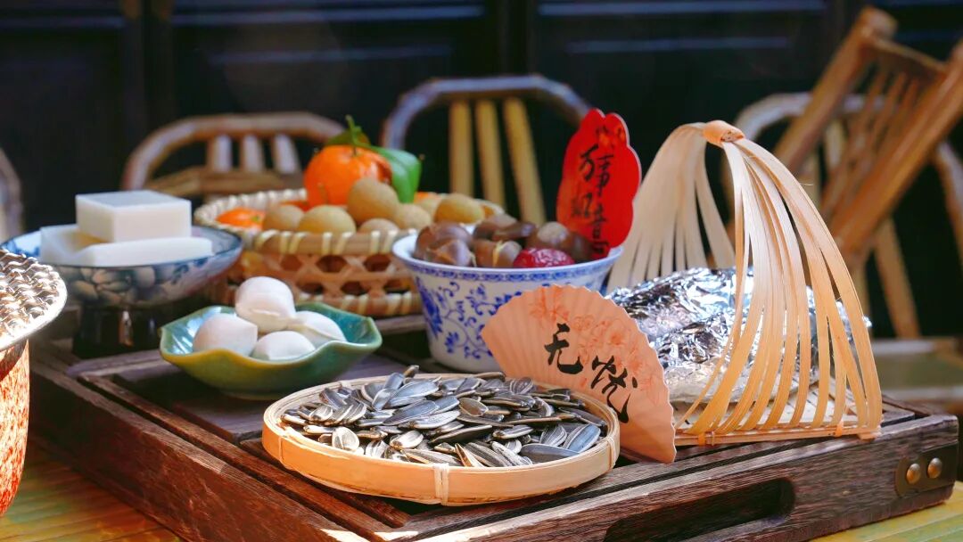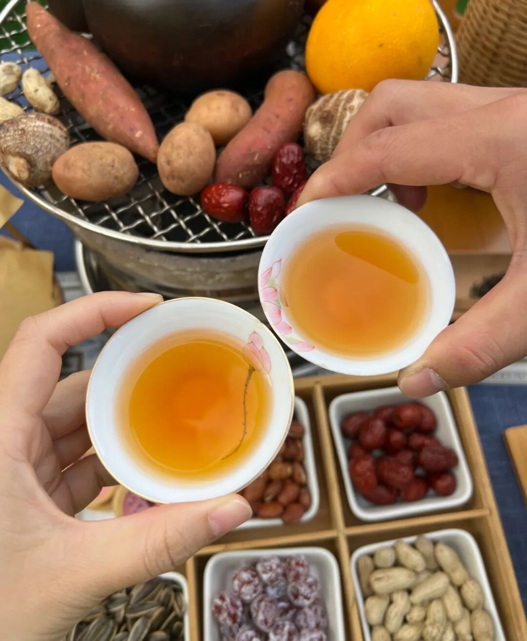 四周摆满的小食拼盘里,瓜子嗑起来清脆作响,山芋与年糕在余温里透着甜糯,红枣、栗子、龙眼、桔子色泽鲜亮,吃一口满是自然果香。最让人惊喜的是那盘包浆豆腐,外皮焦香,内里却软嫩多汁,蘸上少许佐料,豆香混着茶香在口中化开。茶香愈发浓郁时,枣的甜、茶的醇、花生的香层层叠叠,满是治愈的滋味。此刻,围坐炉边,连时光都跟着慢了下来。