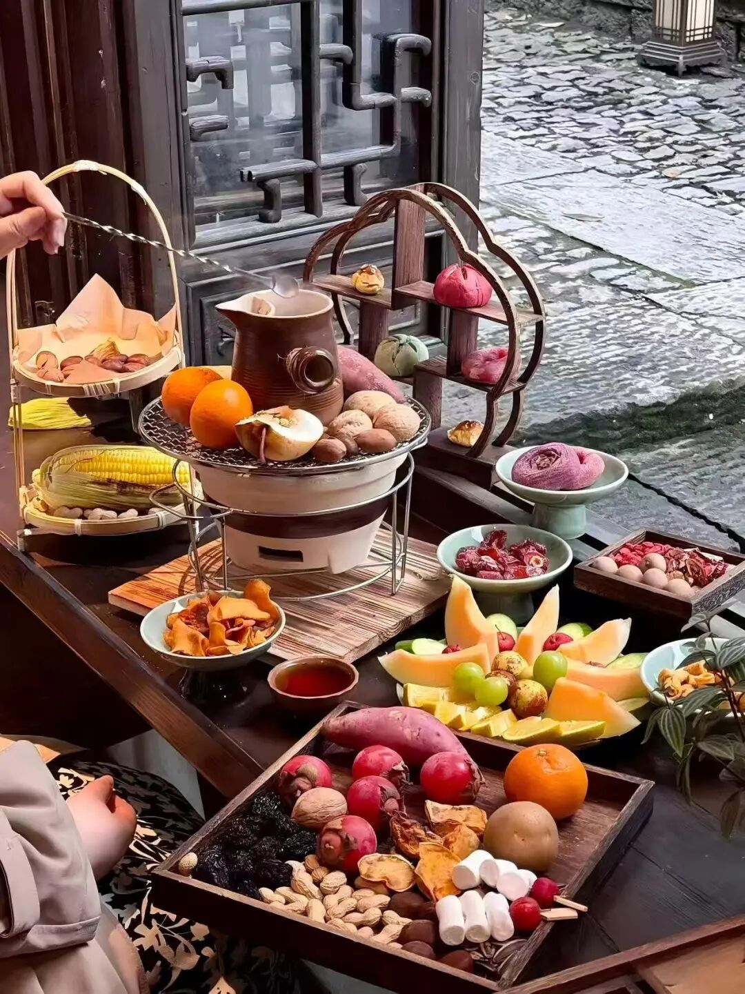 走进咖啡店,白墙灰瓦的古朴肌理间,精致的茶器在暖光氤氲下泛着温润哑光,一缕缕茶香裹挟着点心的甜香,在雅致空间里悠悠弥漫,似是将时光都熬煮得格外绵长。再看精致的食盘里,柿子红得像小灯笼,果肉绵甜;各色坚果在陶碟里堆成小山,酥脆咸香;还有软糯的糕点、酸甜的果脯,与陶壶里煮出的茶汤相得益彰,每一口都是味蕾与心意的精妙共鸣。