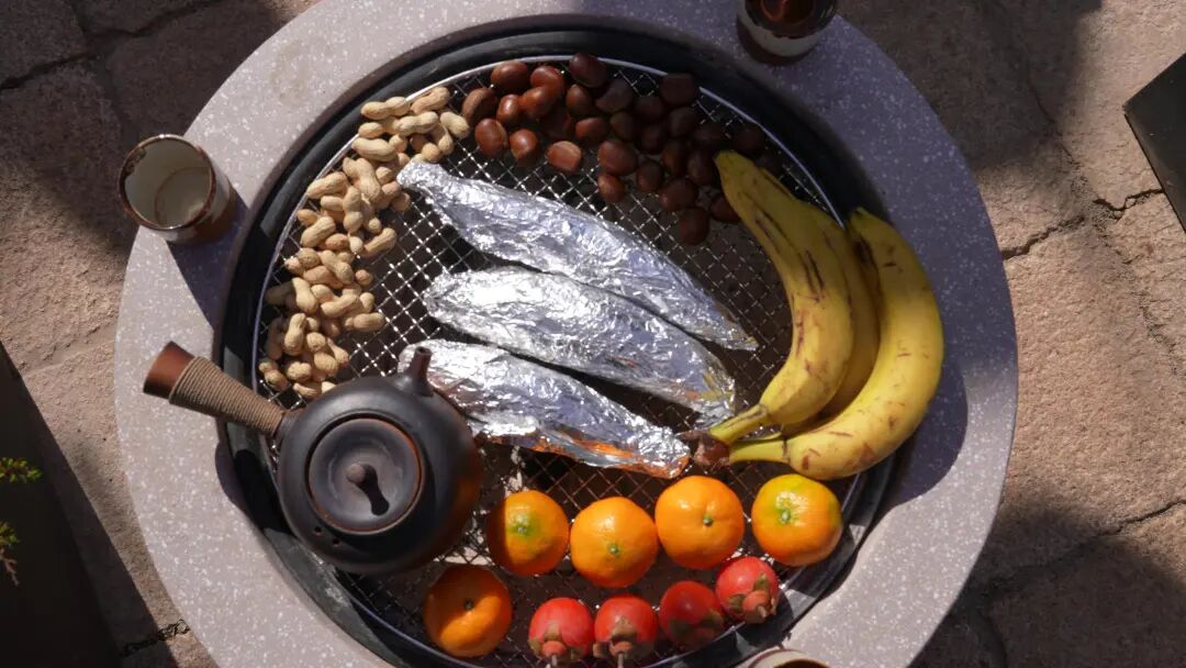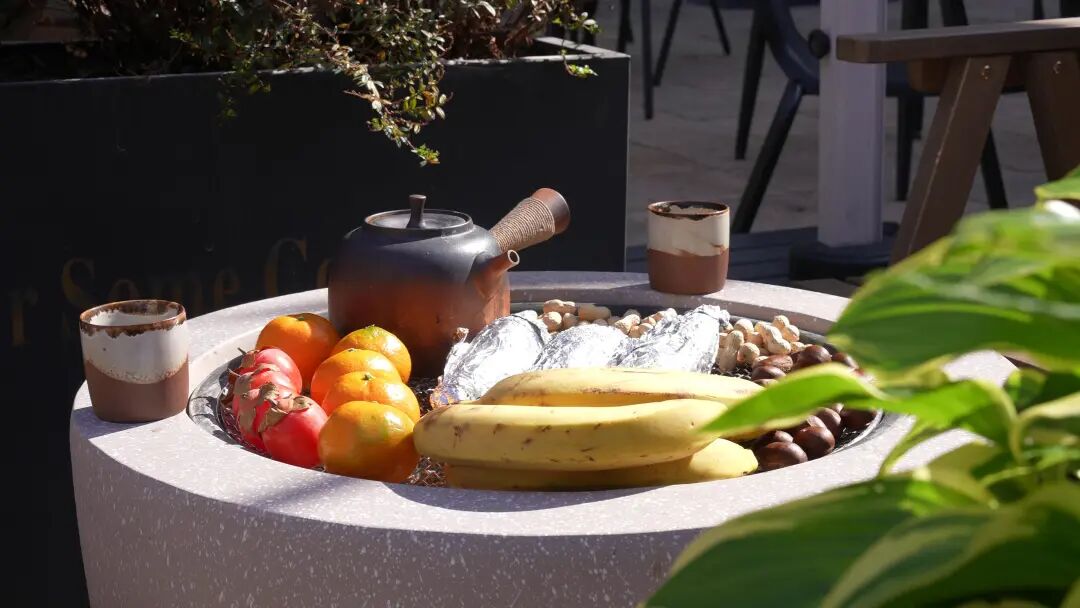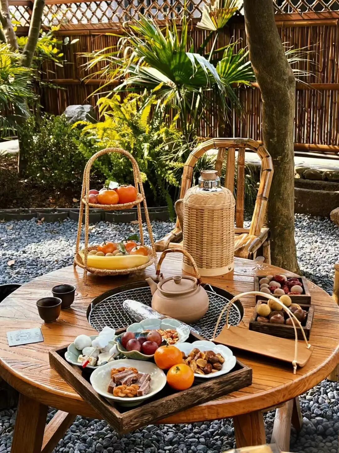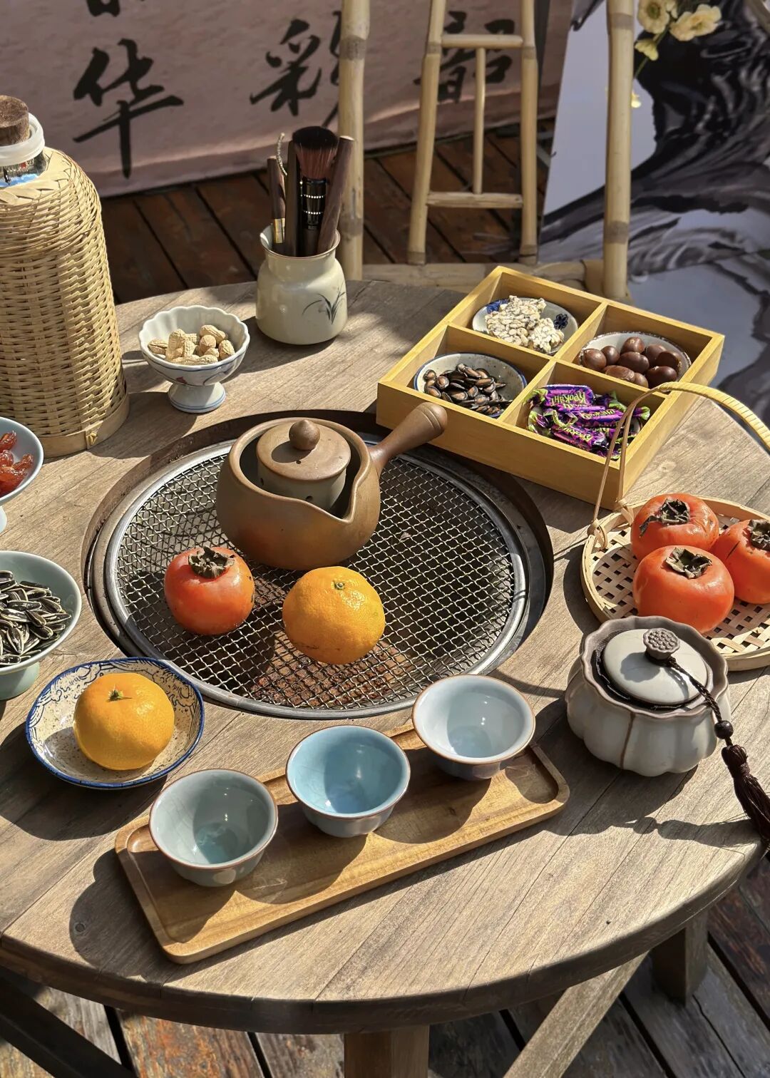 这里的围炉煮茶,煮的不仅是草木清欢,更是江南人家的乡村气息。围坐炉边,炭火噼啪轻响,恰似江阴乡村的温暖絮语,娓娓道来岁月悠长。桌上小食尽是巧思:刚出炉的花生裹着焦香,与炭火慢煮的红茶适配,入口便是熨帖身心的暖意;大栗、柿子、桔子经炭火烘烤,甜香混着烟火气,愈发醇厚动人。抬头是阳光穿叶的斑驳光影,耳畔是池塘流水与闲谈笑语,远处是毗山的青绿轮廓。这般“景中品茶,茶里赏景”的惬意,正是江阴乡村慢生活的真谛。